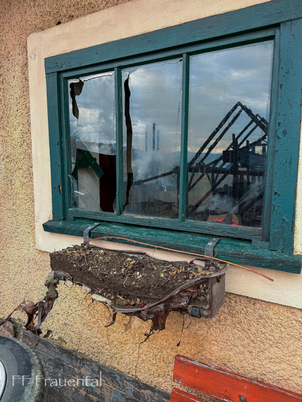 Bereits auf der Anfahrt mussten die Feuerwehrleute von Weitem erkennen, dass mindestens ein Gebäude bereits in Vollbrand stand. Das unmittelbar betroffene Gebäude konnte nicht mehr gerettet werden, sehr wohl aber konnte durch das rasche und gemeinsame Vorgehen der anwesenden Feuerwehren ein Übergreifen des Brandes auf in unmittelbarer Nähe befindliche Gebäude, darunter ein Wohnhaus, verhindert werden. Etwas verkohlte Dekoration und geschmolzene Blumenkisten zeugen von der massiven Hitze.